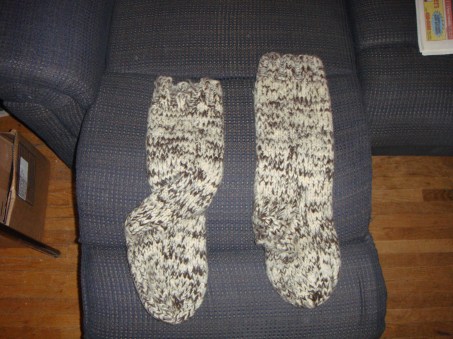 They are really my socks. They do not fit inside of any shoes or boots I own, so, technically, they might not qualify as socks, but as slippers. On cold winter mornings, I wear them around the house. What makes them interesting? I am glad you asked.