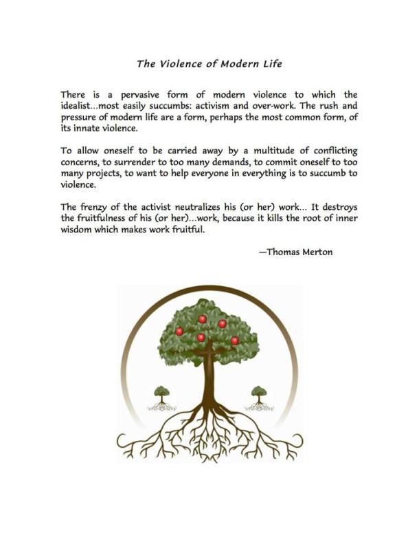 Thomas Merton is one of my favourite authors and spiritual thinkers. He offered a radical definition of violence. This sounds like the opposite of multi-tasking, single-tasking. I hope I can do better as I move forward and take time to listen to the inner teacher and its wisdom.