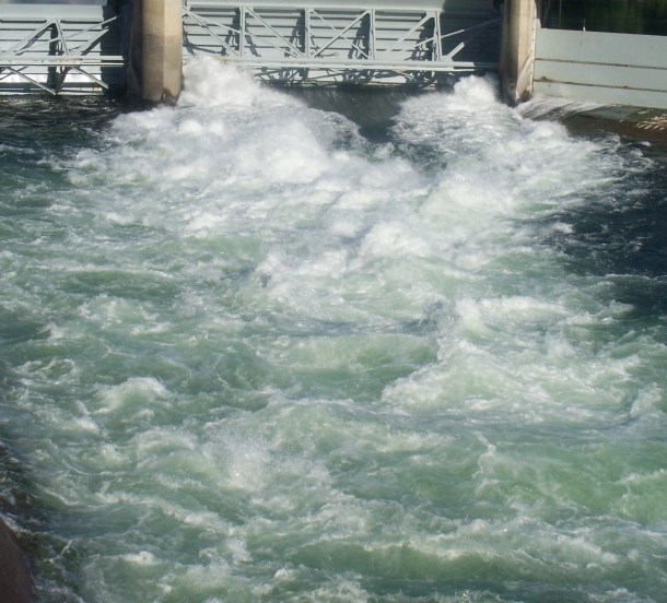 These flood gates are above the upper falls. The river is running high with run off from the mountains and recent heavy rain.