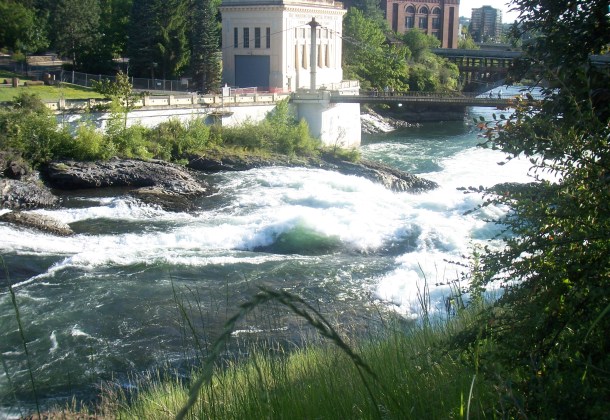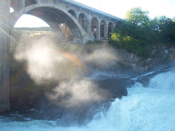 These are the upper falls. You can see one of the older buildings owned by the Washington Water Power Company and two bridges that crosses the river at various places. Some bridges are limited to pedestrian and bike traffic while others carry vehicles as well.