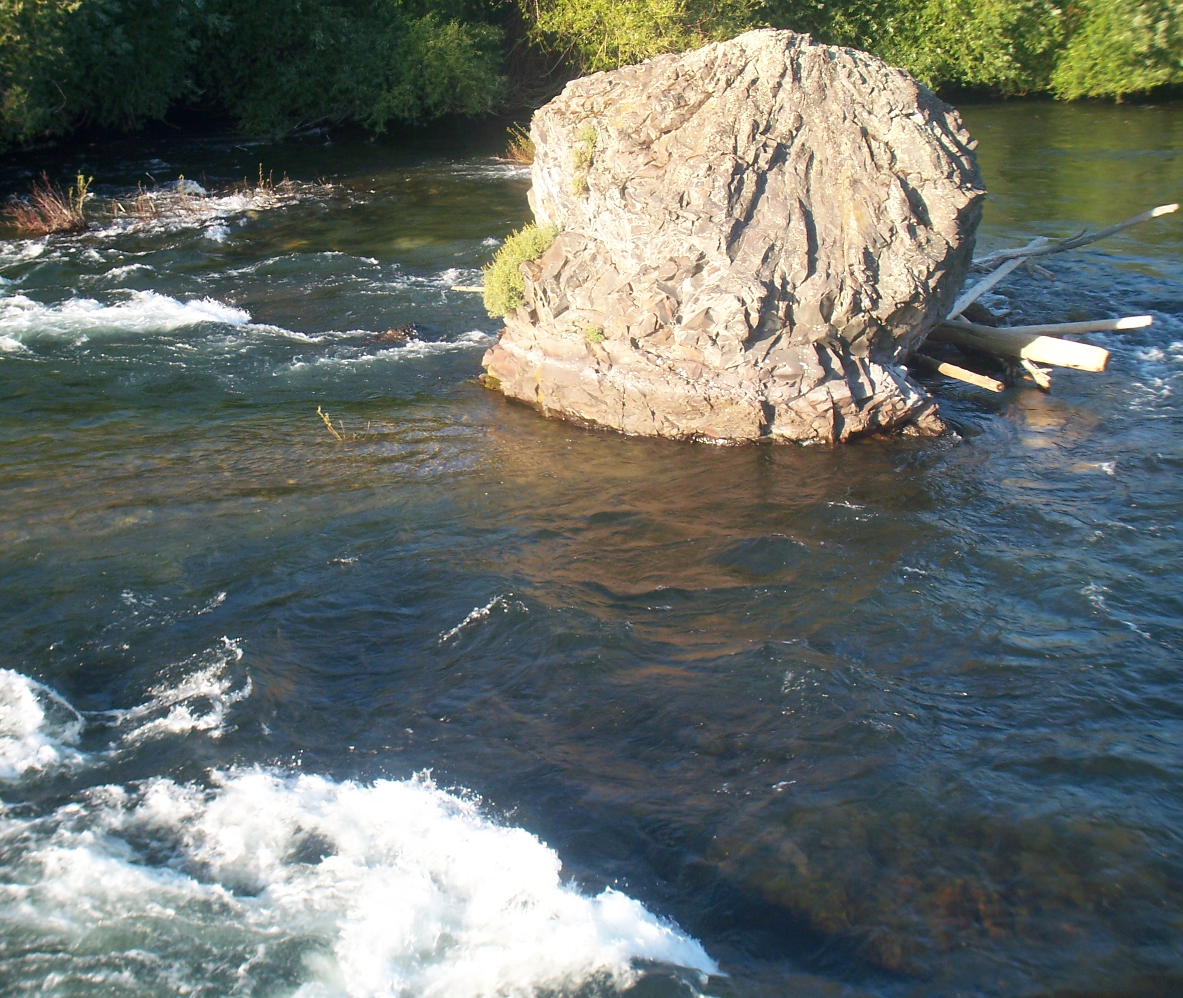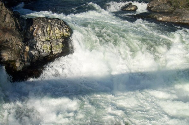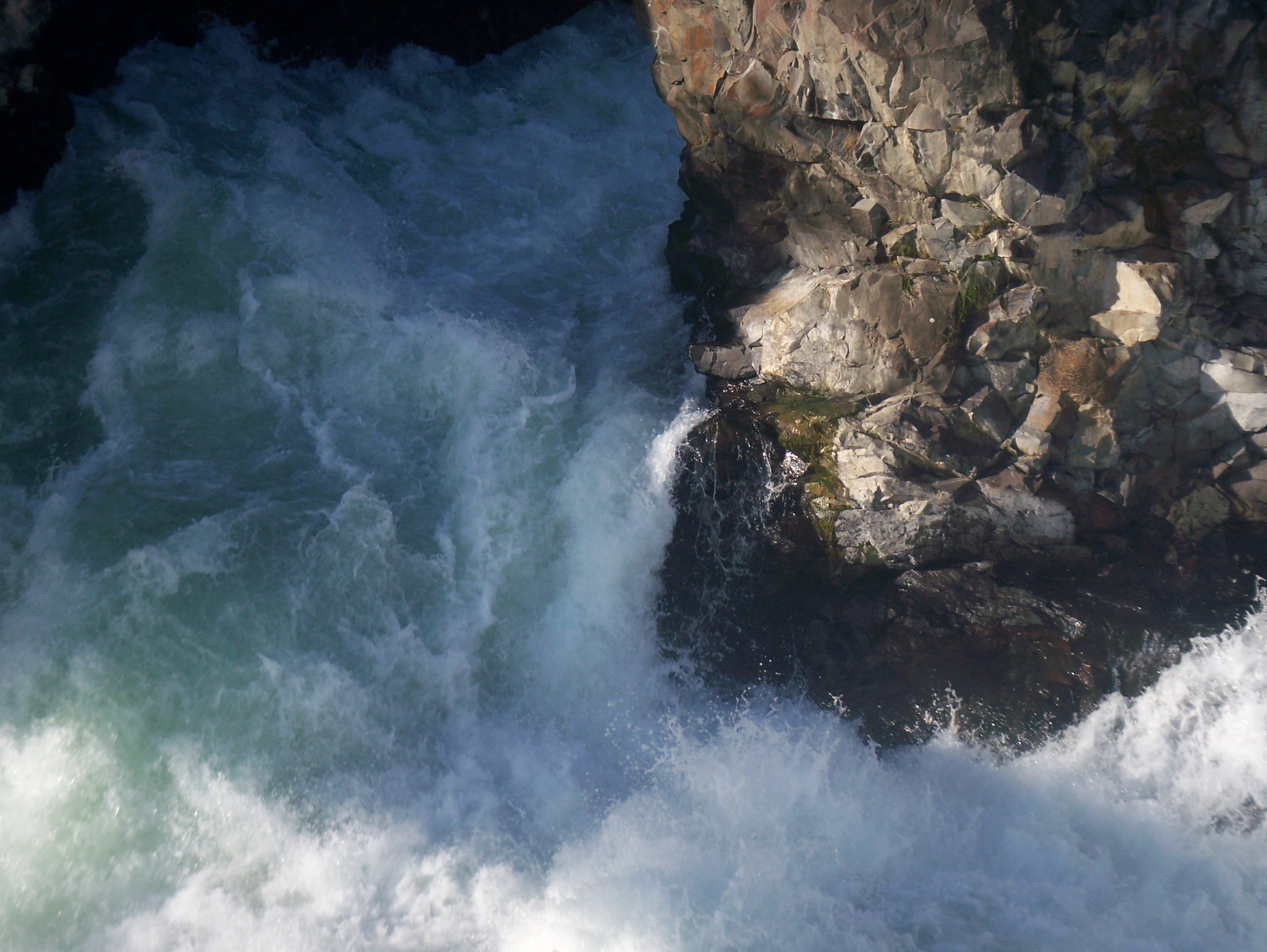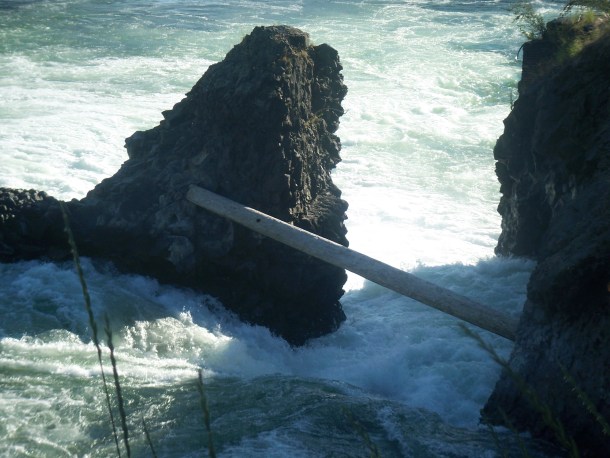 The power of the river was demonstrated with the log wedged solidly into place between two rocks at the base of the plummeting water.