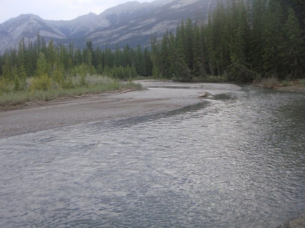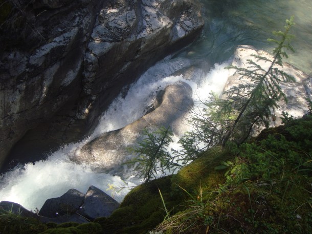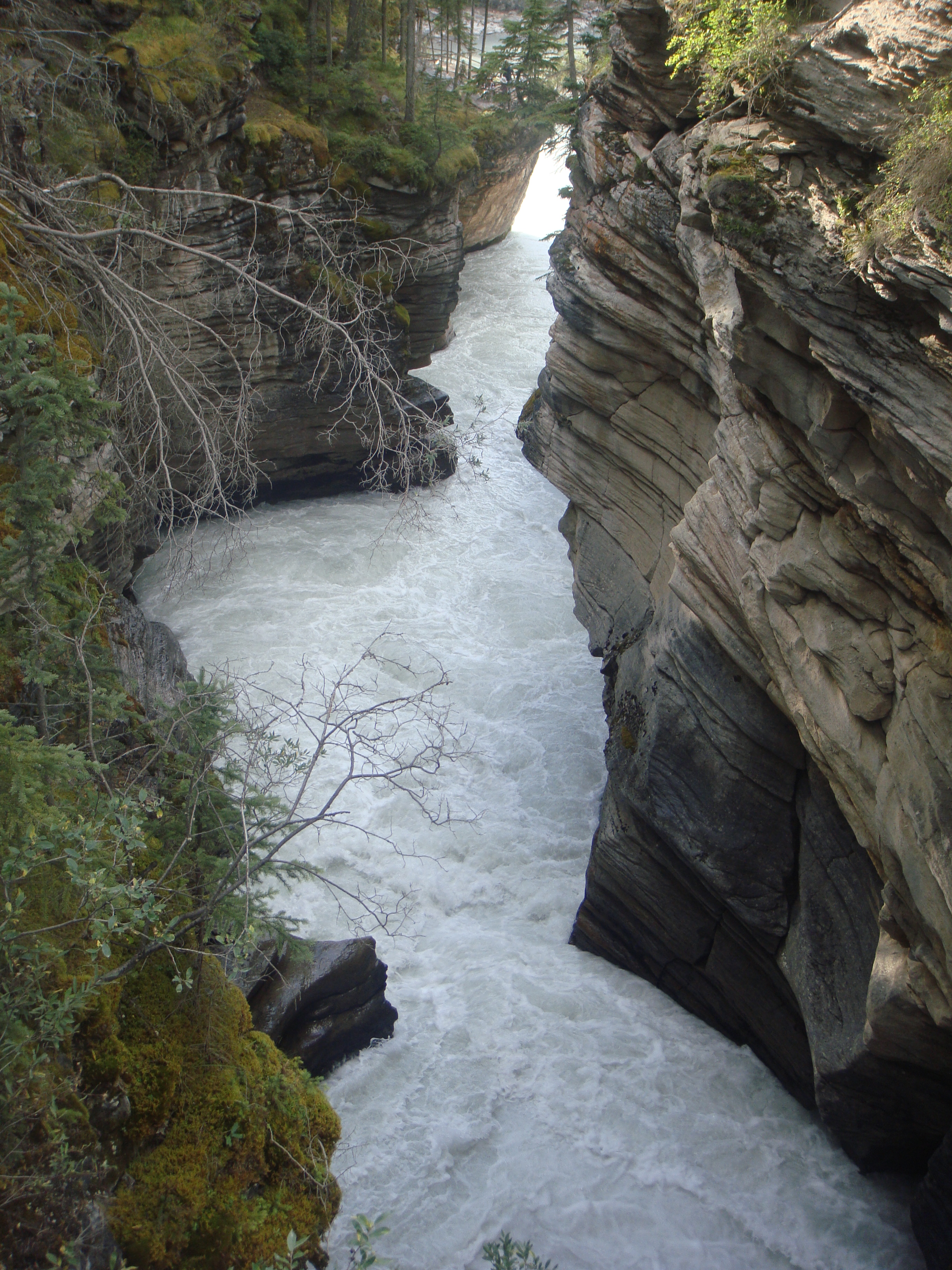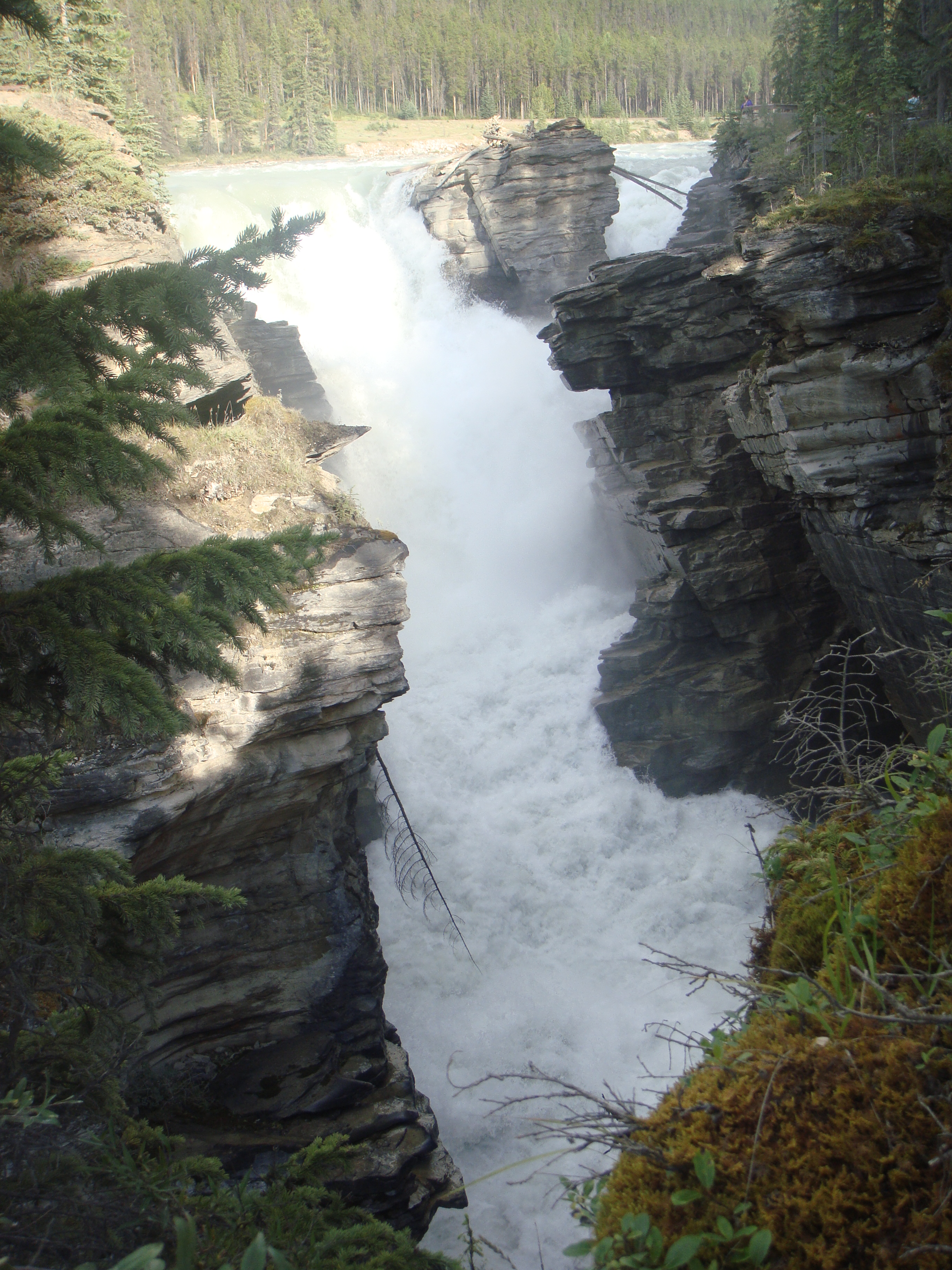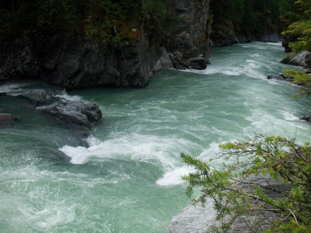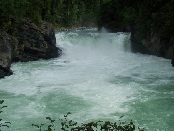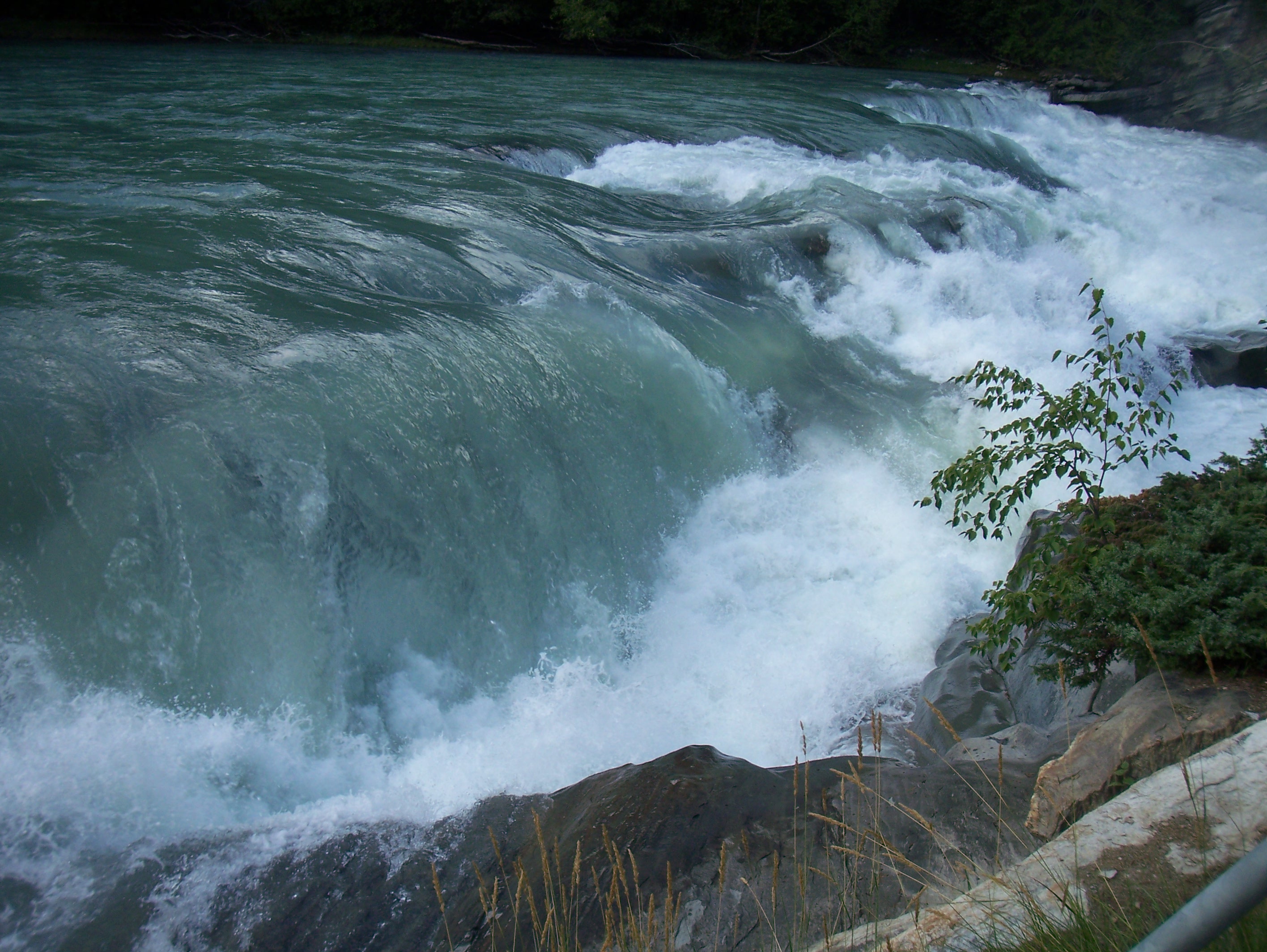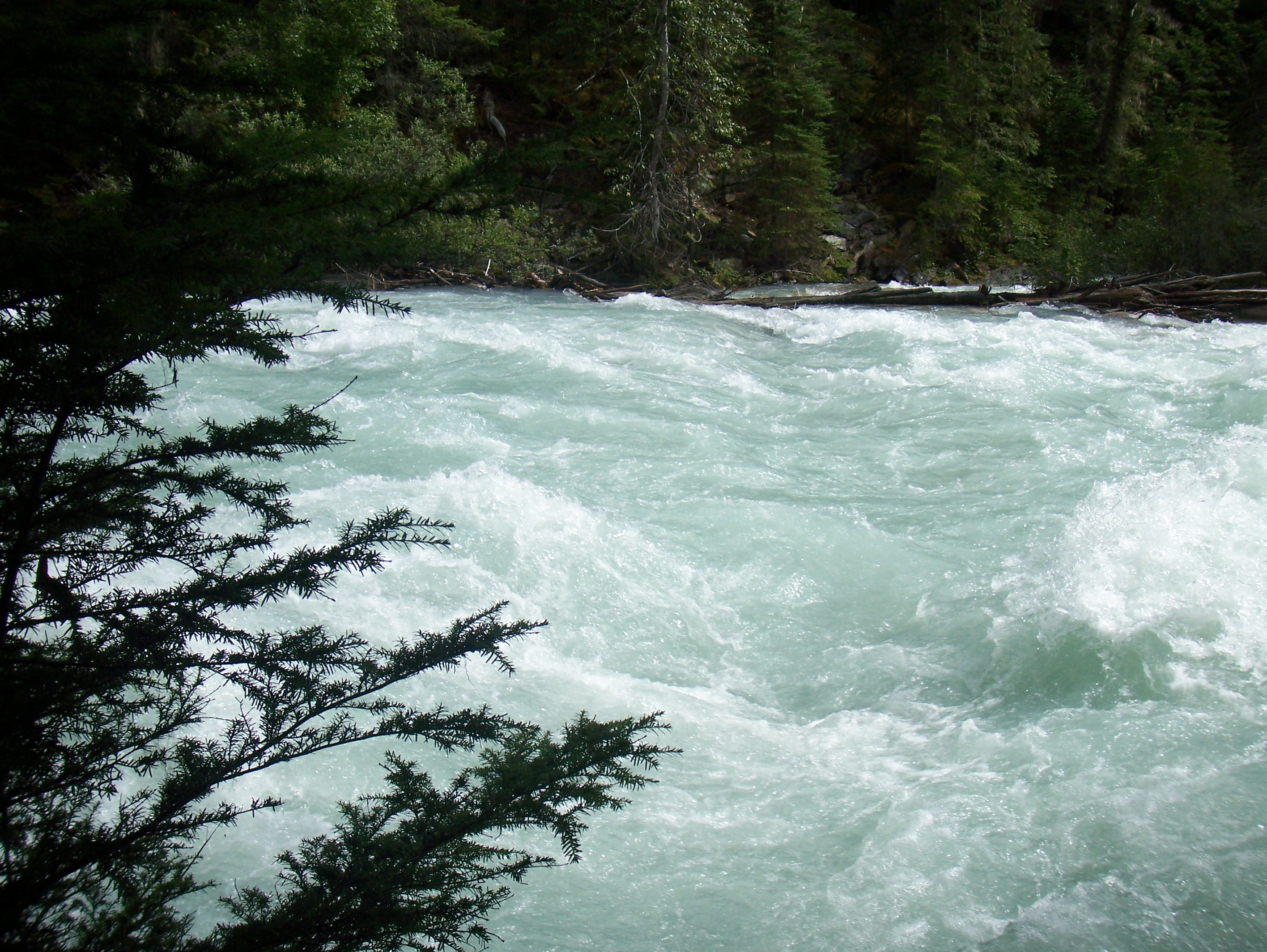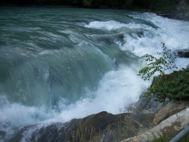 A person realizes the slope of the river when they look at a picture of it below the falls. We captured the blue-green colour of the Fraser closer to its headwaters in these two pictures.