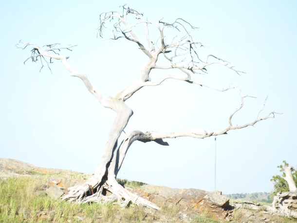 This is the Burmis Tree and is the most photographed tree in Alberta. It is at the east entrance to the Crowsnest Pass. It is a Limber Pine which died in about 1978 and it was 300 to 700 years old when it died. The town of Burmis, like the tree, is dead. It was a coal town and, when the coal expired, so did the town.