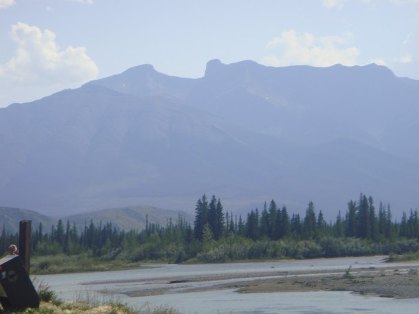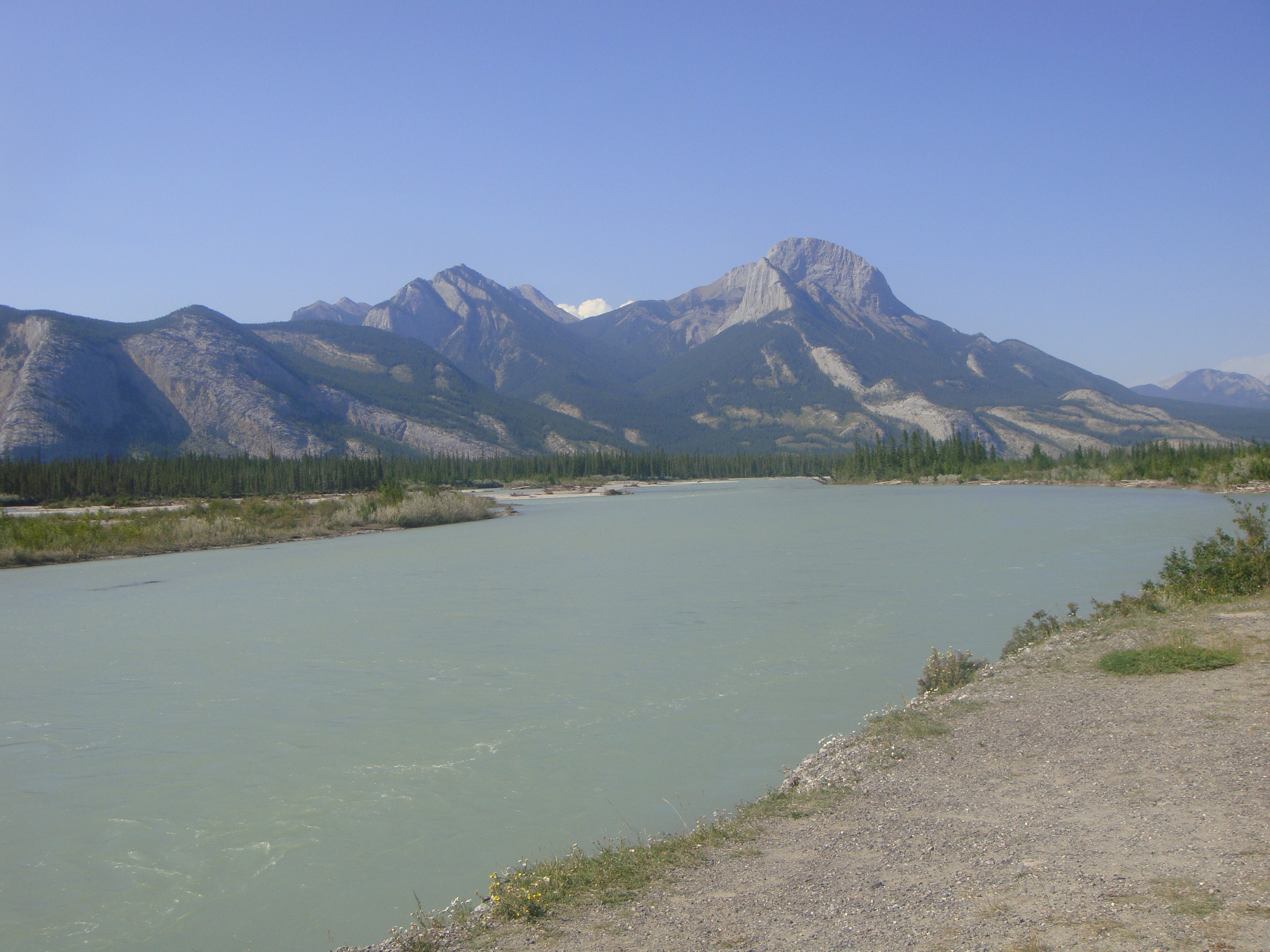 We took the first pictures a few kilometres inside the park. This is looking east and downstream on the Athabasca River. The Athabasca originates at the foot of the Columbia Icefield. It joins the Peace River and forms the Slave River, which flows into the Great Slave Lake where the Mackenzie River discharges and flows to the Arctic Ocean. From the source of the Athabasca a drop of water flows about 6200 km.