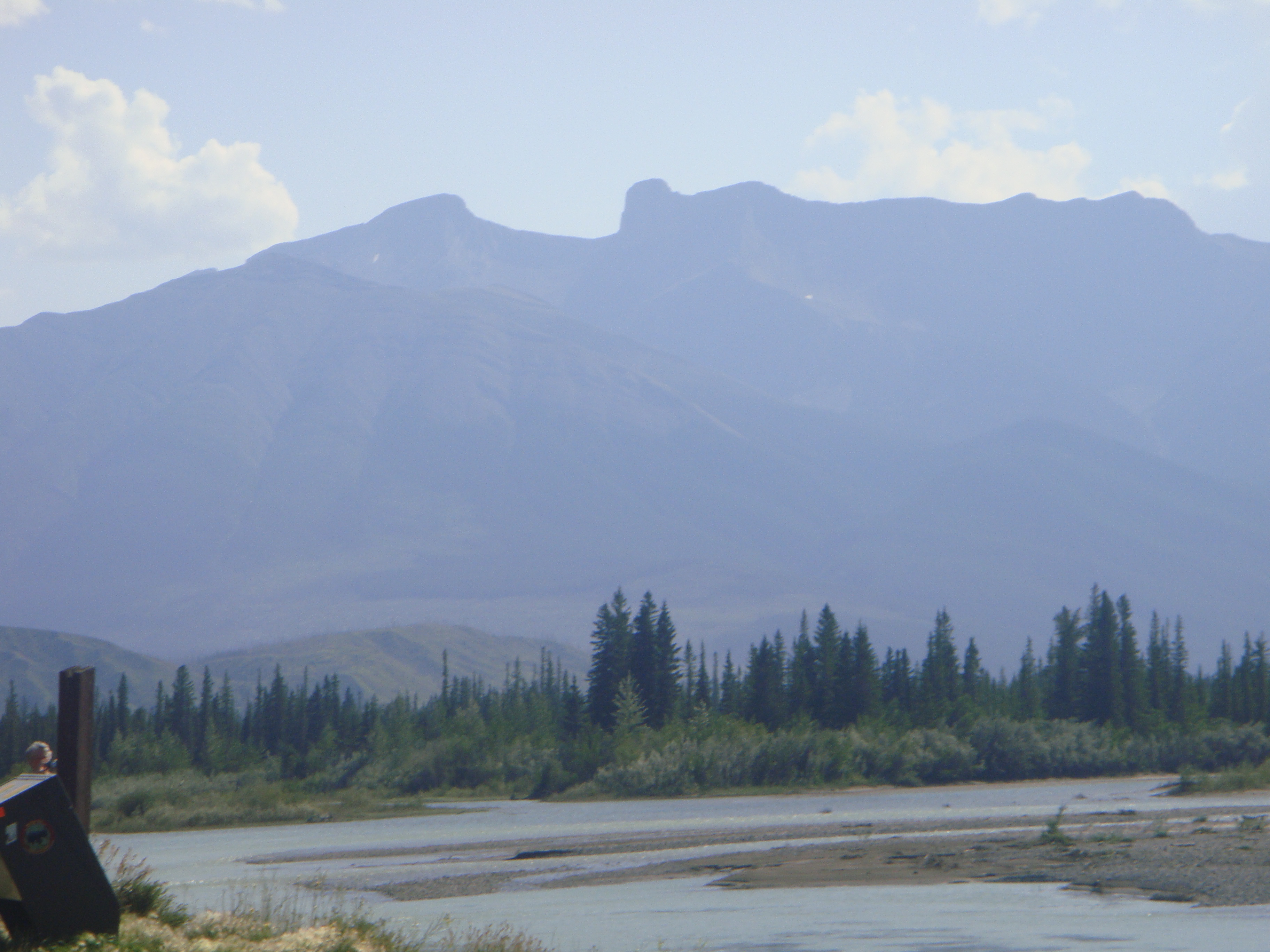 This is an upstream view of the Athabasca River. What looks like a ‘saddle’ on the mountain in the middle, is actually two mountain peaks. As we drove closer to town, the angle shifted and the distinct shape of both mountains became visible. Further upstream, people wade a 100 metres out into the river and, depending on snow melt, there is sometimes only the main channel of the river. Today, it is running high.