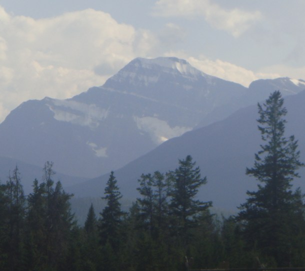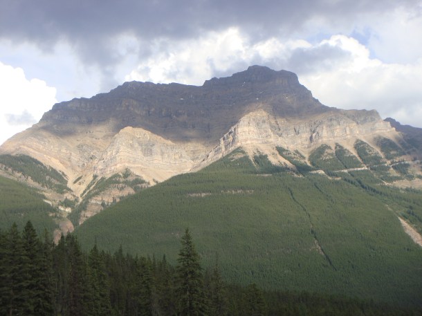 This is Mount Kerkeslin which is on the opposite side of the Highway 93. We took this picture later in the day with shadows and it had become overcast with rain showers popping in and out of the area.