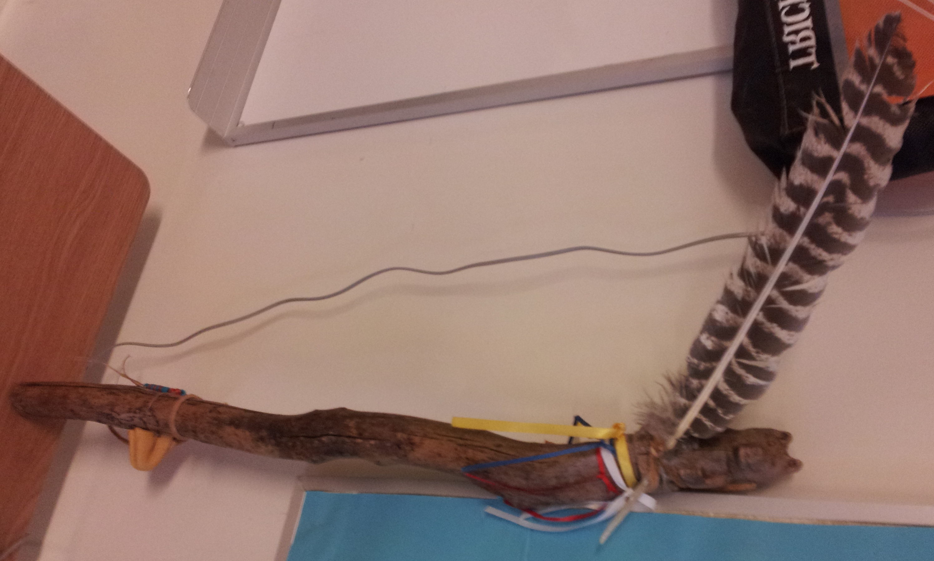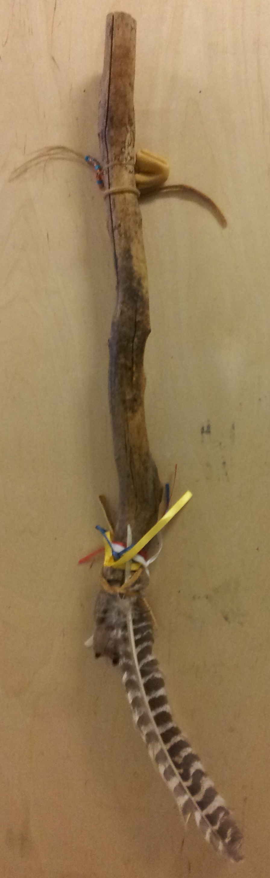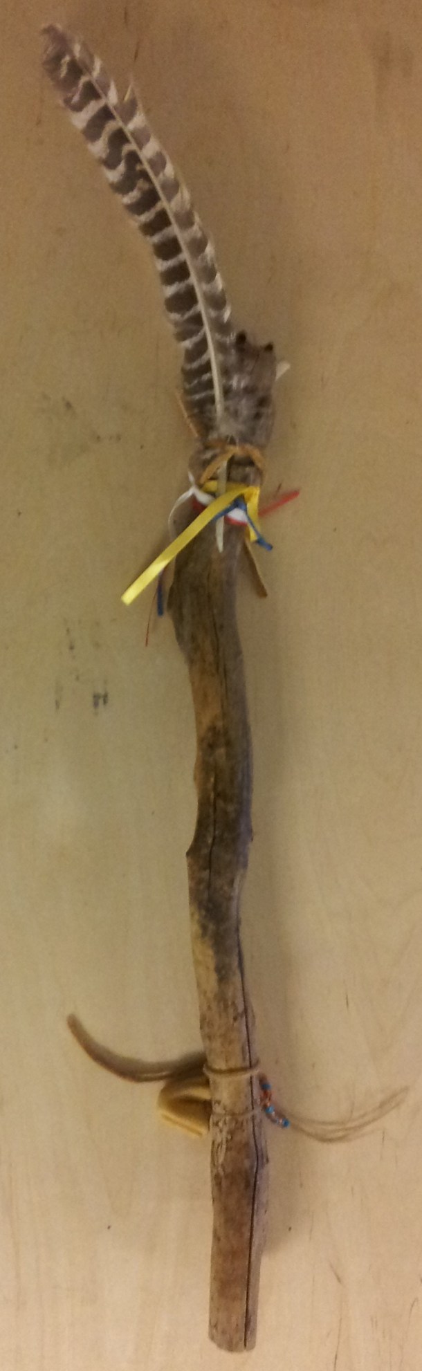 The wood is driftwood which came from a local lake and reflects nature’s contributions to the circle. Someone carved a bear head into the top of the stick. In some traditions, the bear symbolizes courage, freedom, and power. The feather is from a hawk. Hawks are visionary and guide the person. The coloured ribbons represent the four directions in the circle. The parent attached a medicine bag. The medicine bag heals, guides and protects, and has materials or objects of value to its carrier.