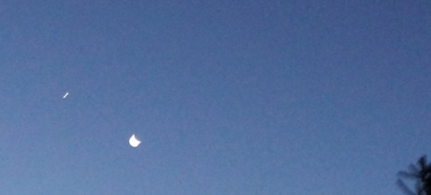 I walked out of the house and looked up at a clear sky. The Moon stood out in the sky and just below was a morning star. It is not a great picture, but it reminded me I live in a metropolitan area of over 1 million. I find my self rewarded when I take the time and see nature in that place. They are there; I only have to look for them.