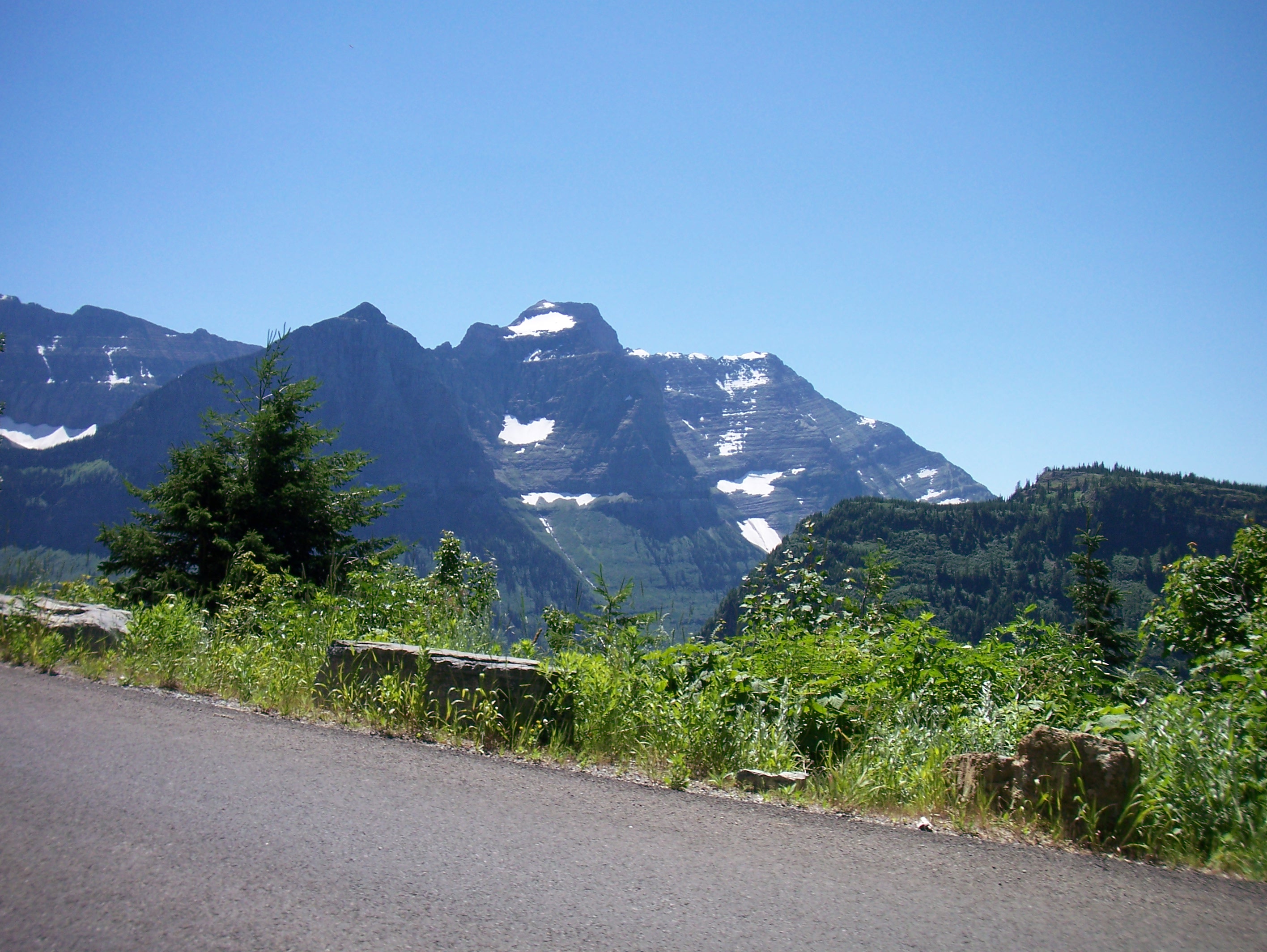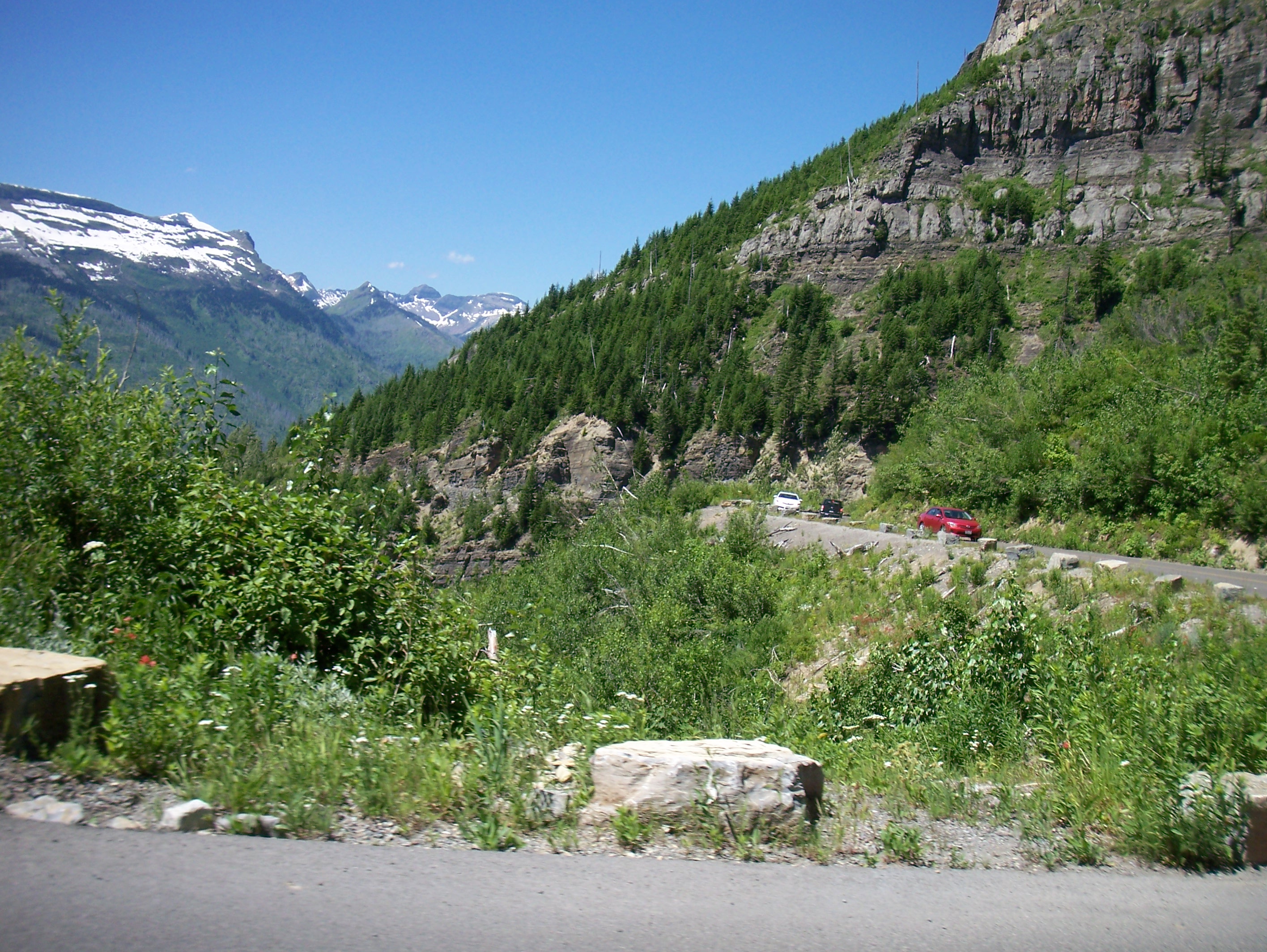Looking straight across from the road, you can see the ice and snow almost at eye level and further out is Jackson Glacier. The road is dotted with short barriers and are not very wide.