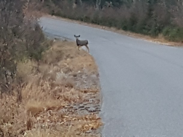 I walked each morning and afternoon. This doe crossed the road about the time the sun was coming up each morning. She kept an eye on me, just to make sure.