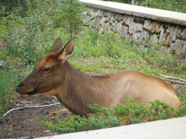 It was a perfect day. We wandered in Jasper National Park, enjoyed scenery, surprises and I was with my favourite person. We found the best at the end of the day. I posted a picture of a bull elk on Yellowstone 2005 . I took that picture from 15-20 metres. Kathy took this picture of a cow elk chewing her cud. She seemed aware of our presence. We were quiet and, as others joined us in a secluded area, she posed. The wall was about 1 metre thick wall and a similar height.